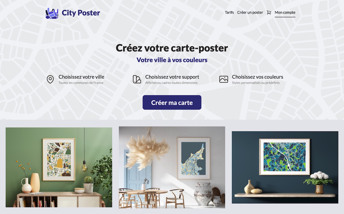 City Poster est une boutique en ligne de posters de villes du monde entièrement personnalisables, du cadrage à la palette de couleurs. Elle permet de commander des affiches encadrées de haute qualité représentant des plans stylisés de toutes les communes de France et d'autres villes à travers le monde. Chaque poster est généré à la demande en fonction des préférences du client, offrant ainsi une décoration unique et personnalisée pour les amateurs de voyages et de design urbain.