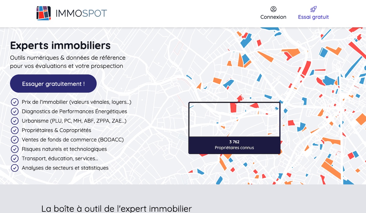 Immo Spot est une startup indépendante fondée en 2022. C'est une plateforme SaaS destinée aux professionnels de l'immobilier sous forme d'abonnement. Elle permet de consulter les données immobilières ouvertes par les ministères français et de générer des rapports d'analyse. Les données sont cartographiées et incluent les prix de ventes, les règles d'urbanisme, les risques, les références cadastrales, les propriétaires, les copropriétés, et de nombreuses autres données utiles à l'expertise et à la prospection immobilière.